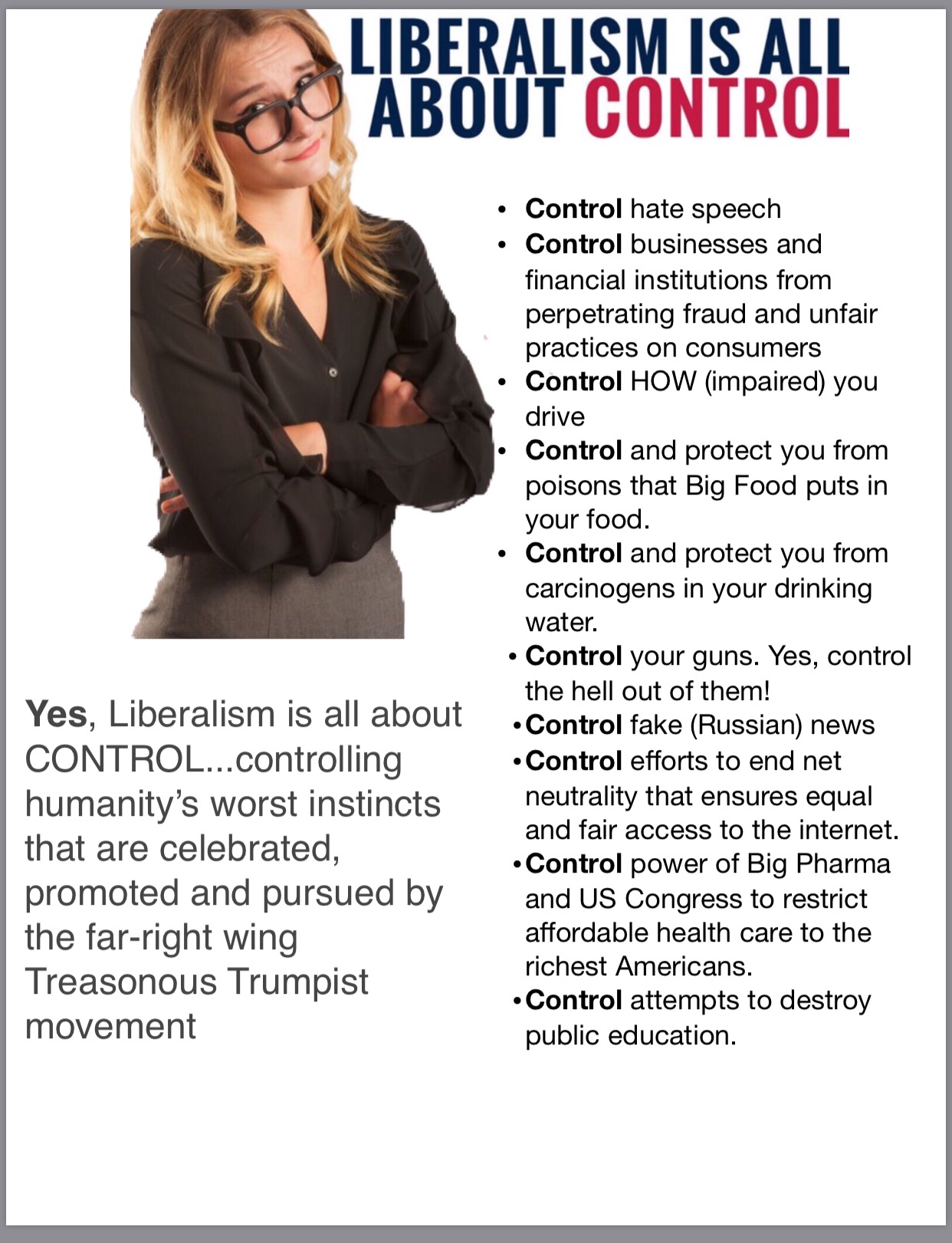 Came across this “Liberalism is all about control” post on social media recently. Probably from a Russian troll. My response below this.